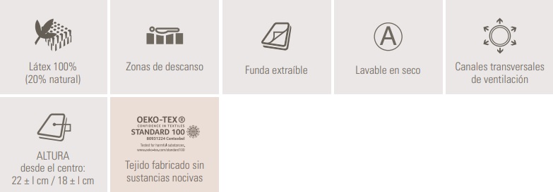 Elaborado sin utilizar sustancias nocivas en la fabricación del tejido, se han utilizado colas con certificado ecológico. Cuenta con canales transversales de ventilación que permite la máxima transpiración durante tu descanso. Además permitirá un fácil mantenimiento y limpieza con su funda extraíble y la posibilidad de lavable en seco.